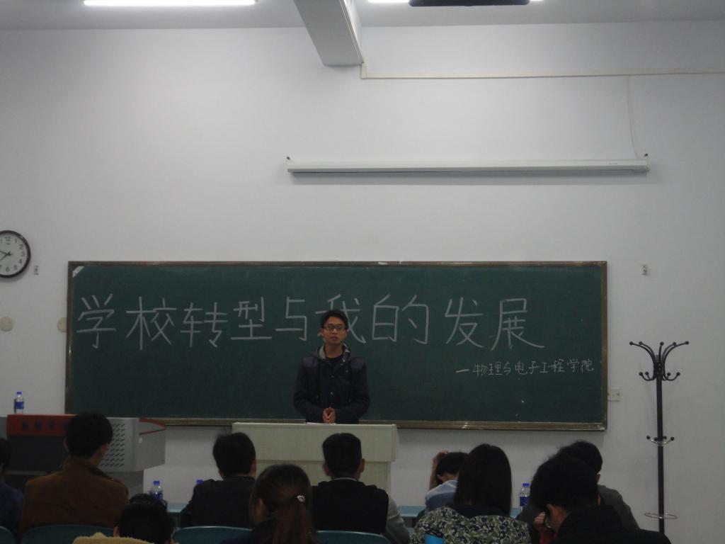为了让学生们了解高校转型的意义与重要性,减少学生面对就业问题时的窘迫感。于3月31日晚,物理与电子工程学院以“学校转型和我的发展”为主题的演讲比赛在A05号楼206号教室成功举办。