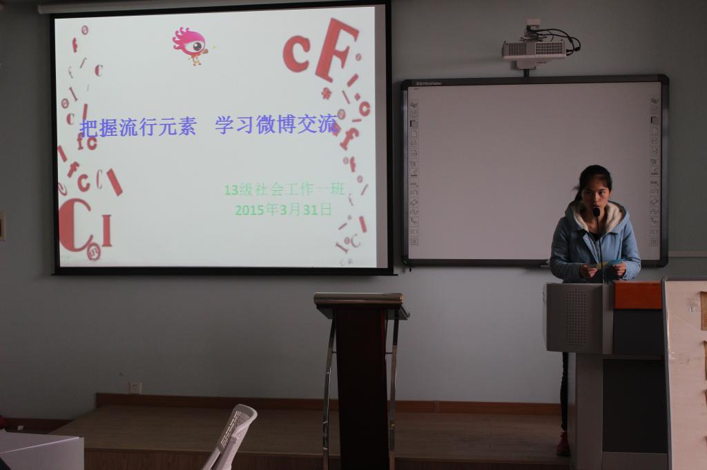 为了丰富同学们的课余生活,促进微传播交流。4月2日下午3时20分,政法系14级社会工作二班在A-01社工实验室举办了“把握流行元素 学习微博交流”主题教育活动,此次活动由社工二班团支书程秀萍主持。