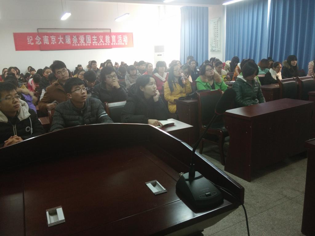此次活动主要分为三个环节。首先活动负责人向大家播放了南京大屠杀相关影片《南京,南京》,影片中一个个触目惊心的画面让在场的所有人都心痛不已,奇耻大辱震撼着每个人的心灵,血的教训让大家深深的明白了“落后就要挨打”的道理。影片结束后,来自历史与社会发展学院的衡芳珍博士为大家进一步讲述了南京大屠杀的详细过程,正义的审判,关于南京大屠杀的历史记忆以及国家公祭。活动最后,同学们纷纷参与爱国签名,表达对祖国的热爱之情,以及对逝去的同胞的追思。