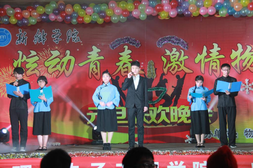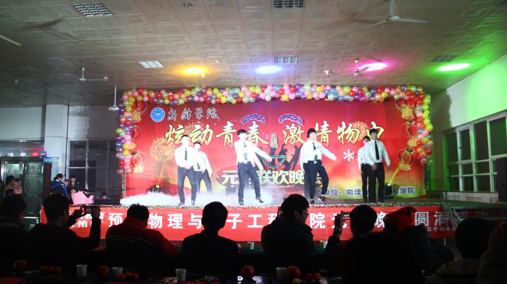 餐厅二楼内灯火辉煌,彩带飘扬。晚会开始时,孙汝斌书记发表了热情洋溢的新年致辞,回顾过去,展望未来,并表示了对物理与电子学院学子寄予的殷切希望。SKY乐队热血澎湃的《故乡》迅速点燃现场气氛,小品《偶像团》以奇特新颖的视角带给大家全新的感受,舞蹈《不要不要》,《八戒八戒》活泼动感的舞姿,热烈奔放的表演赢得现场观众的阵阵掌声。整场晚会活力四射,蓬勃向上,其中由我院系学生会出演的超级搞笑歌曲串烧加终极《广播体操》更是给在场观众带来视觉和听觉上的冲击。台上演员表演精彩,台下观众热情高涨,整个餐厅二楼成了一片欢乐的海洋。最后,晚会在恬静安谧的手语《仰望星空》中圆满落幕。