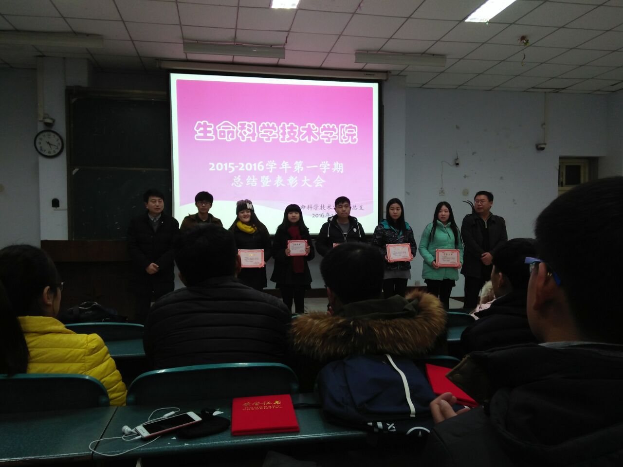 过去的一年,在院系领导的正确领导下,学院学风进一步好转,学生学习劲头继续增强, 在工作的各个方面都取得了显著的进步。表彰大会在学生会主席姜亚力的主持下拉开帷幕,此次表彰大会有“文明宿舍奖”“学生会优秀干事奖”“元旦晚会优秀主持人奖”“元旦晚会优秀节目奖”“啦啦操团体奖”“优秀话剧奖”等荣誉称号。共58人获得荣誉。他们是生命科学技术学院广大同学和班集体中的优秀代表,平时都在学生活动中表现优异。颁奖结束后,大会圆满成功。