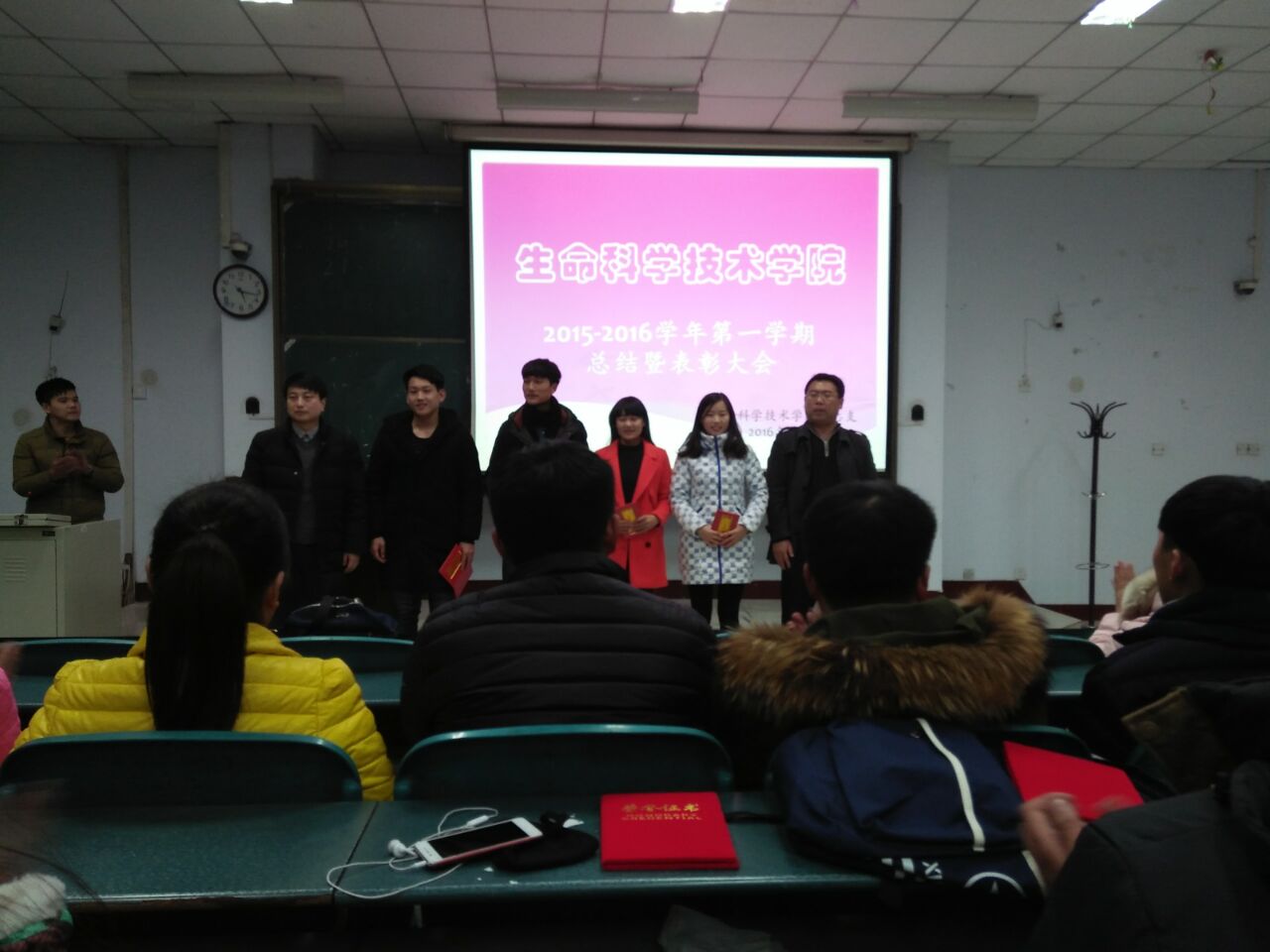 生命科学技术学院于1月5日在A05-208报告厅举行了2015至2016学年第一学期总结表彰大会。生命科学技术学院党总支书记田涛老师,党总支副书记张萌老师,团总支书记文文老师以及各级辅导员老师出席了此次大会,并分别为获奖学生颁奖。大会由学生会主席姜亚力进行主持。