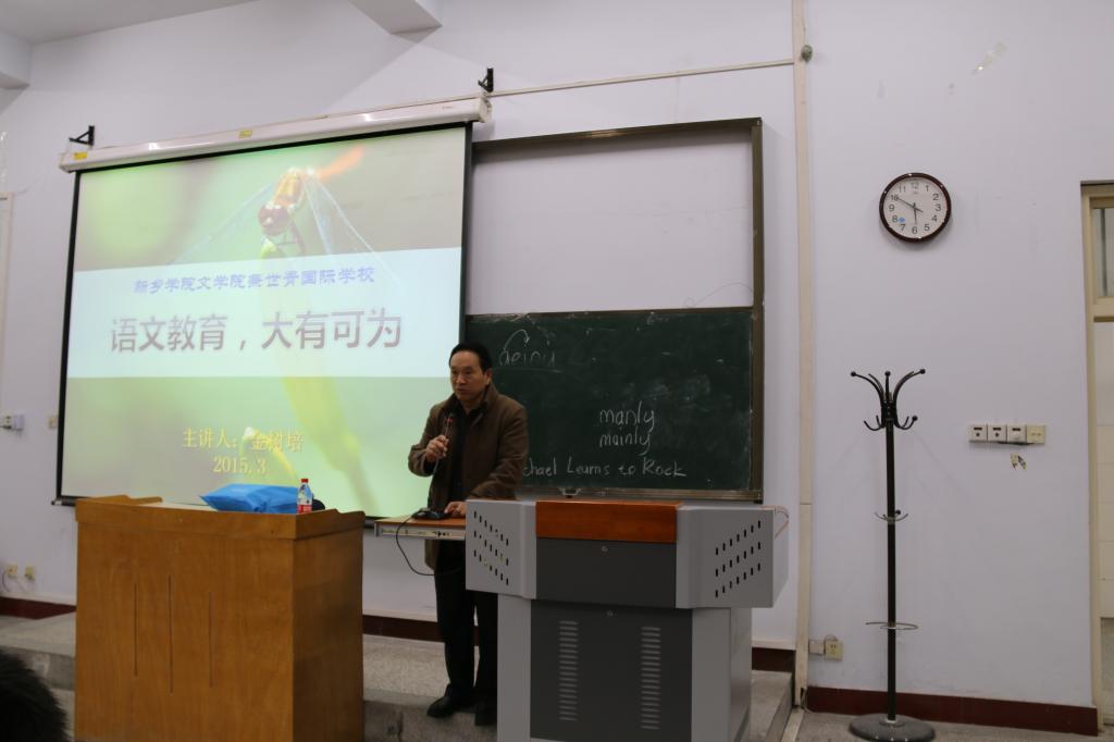 为提高师范专业学生们的专业技能,文学院于11月15日下午4点在A01-323教室进行《语文教育,大有可为》讲座,由新乡学院文学院兼世青国际学校教师金树培主讲,14级汉语国际教育一班二班和15级汉语言文学一班二班同学参加此次讲座。