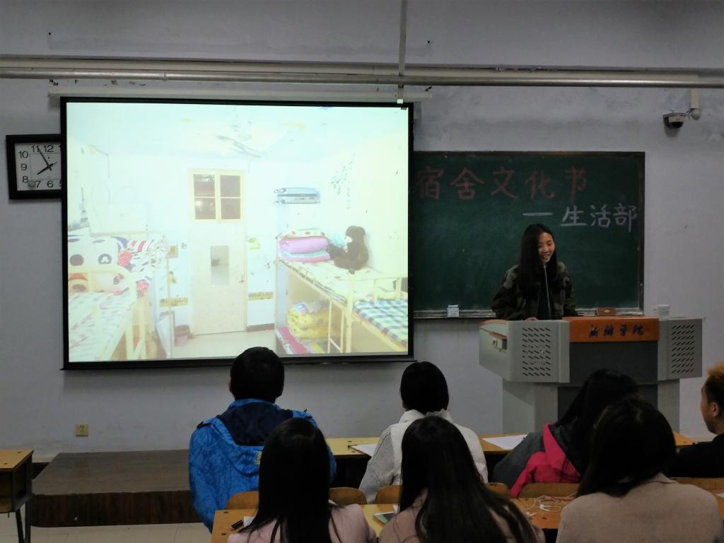 16日晚七点,活动正式开始。首先,各个参赛宿舍的负责人用精美的PPT对自己的宿舍进行展示和详细的讲解,每一间宿舍在同学们的精心布置下都散发着浓浓的家的味道,朴素而又优雅的格调彰显出了当代大学生的动手创造能力和天马行空的想象力。然后,主持人对每个参赛的宿舍进行了简短的概括。紧接着,计分员对每个参赛宿舍进行打分评比。最后,由计分员计算各个参赛寝室的得分,并评选出名次。主持人对此次活动进行了总结,希望同学们能把这样美丽的宿舍保持下去,相亲相爱,共同经营宿舍大家庭。