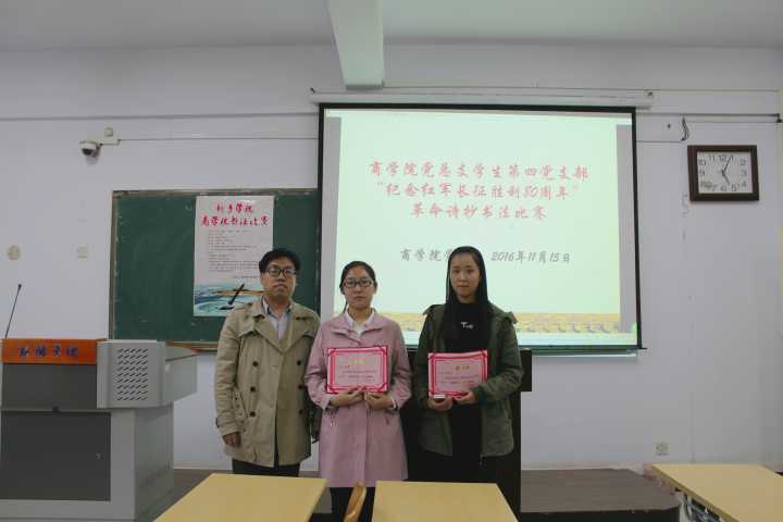为贯彻学习习近平总书记“不忘初心,继续前进”的指导思想,激发同学们爱国敬党之心,传承我国传统特色书法文化艺术。在院系领导的大力支持下,11月15日下午3点半由商学院四年级党支部承办的商学院纪念长征胜利80周年革命诗抄书法比赛成功举办。党总支副书记张胜利老师,团总支书记温敬敬老师,四年级党支部书记张海燕老师及辅导员老师们担任此次大赛评委。
