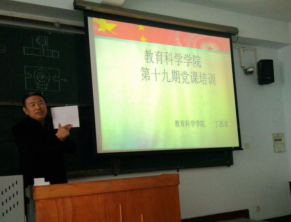 为增强大学生的社会使命感和责任感,充分发挥入党积极分子在构建和谐校园中的先锋模范作用,积极向党组织靠拢,教育科学学院于11月8日下午三点于A11—313教室开展第十九期第一次党课培训,此次党课培训有幸邀请到教育科学学院的党总支书记丁西省前来授课。