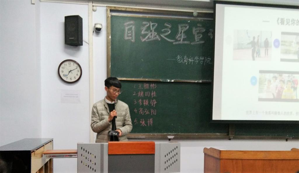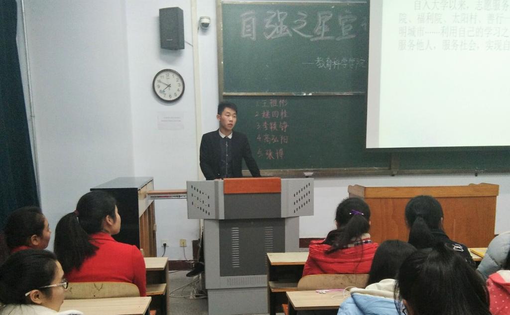 为了鼓励大学生奋发向上,进一步宣传在校大学生积极进取,拼搏奋进的感人事迹,树立一批勤奋学习、不畏困难、勇于进取的先进典型,引导更多的学生向身边的榜样学习,在全校范围内进行自强之星宣讲活动。教育科学学院于11月29日下午六点半在A11-313教室开展自强之星宣讲活动,此次活动由团副金宇杰主持。