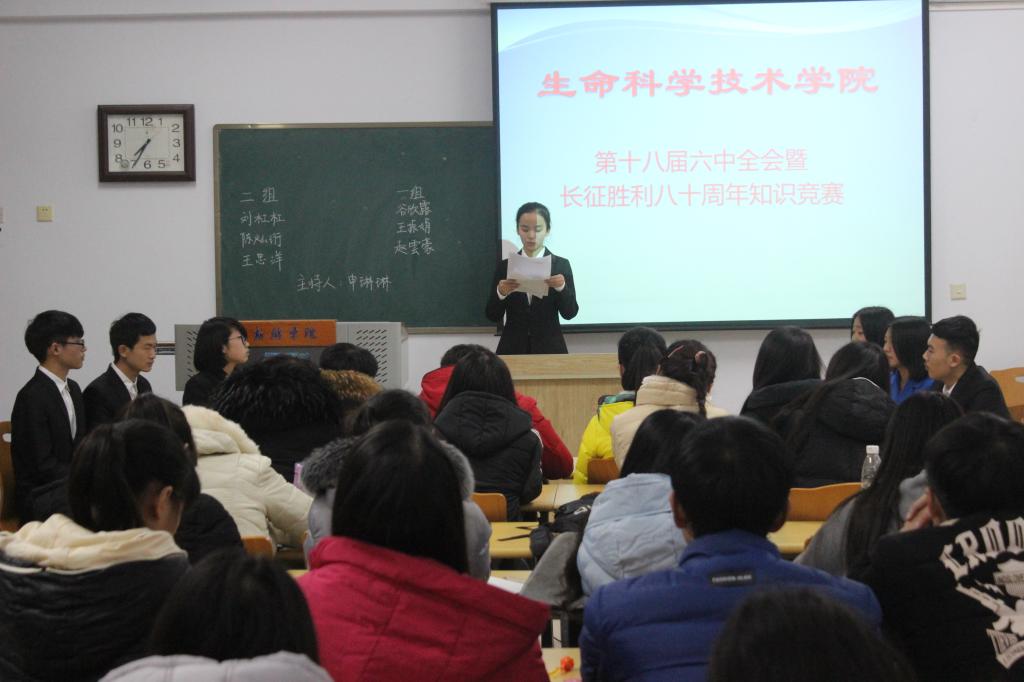 为贯彻学习十八届六中全会精神、纪念长征胜利八十周年,12月21日晚,生命科学技术学院在A14-601举行了以十八届六中全会暨长征胜利八十周年为主题的知识竞赛,生命科学技术学院两支代表队参与此次比赛,学生会主席团及各部部长担任评委。