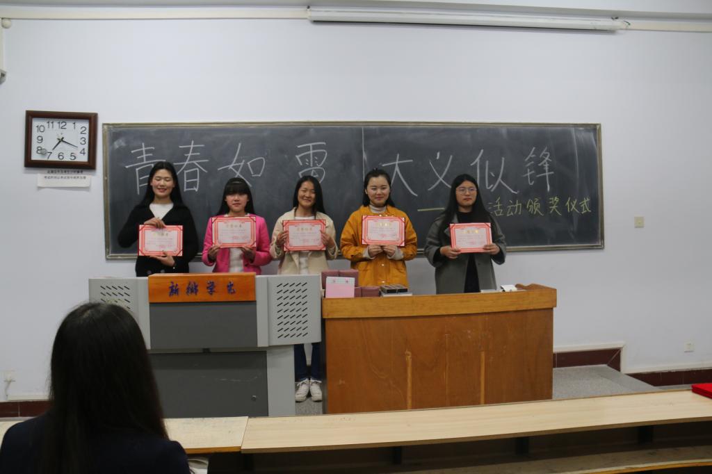 为弘扬雷锋精神,广泛开展社会主义核心价值观教育,加强文学院精神文明建设,掀起文学院学习雷锋精神的热潮,文学院团总支学生会与外国语学院团总支学生会于三月初组织举办了以“青春如雷,大义似锋”为主题的雷锋征文活动。3月24日晚7点在A11- 405教室举行了颁奖仪式。