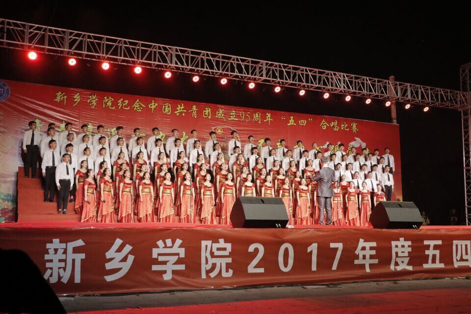 新乡学院于5月5日晚七点在西区国旗广场举办了“五四”表彰大会暨以“青春喜迎十九大,不忘初心跟党走”为主题的纪念中国共青团成立95周年大合唱比赛,新闻传播学院百余名师生参加了此次活动。